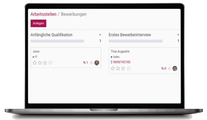 Sie können jede Stufe (z. B. Neu → Interview → Angebot → Eingestellt) individuell definieren, Bewerber mühelos zwischen den Phasen verschieben und den Überblick über den Fortschritt behalten.
