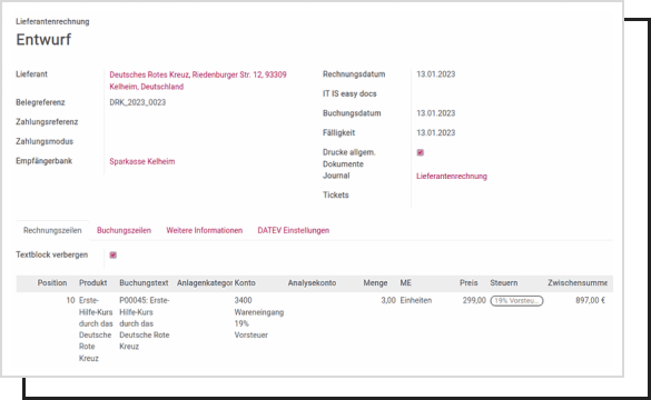 When you receive a supplier invoice in the Factur-X / ZUGFeRD format, ITISeasy.business extracts