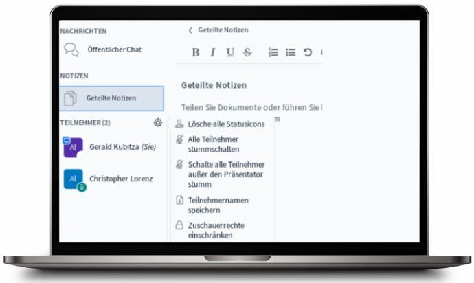 - Restrict viewer rights (webcam, microphone, chat, notes, see other participants)