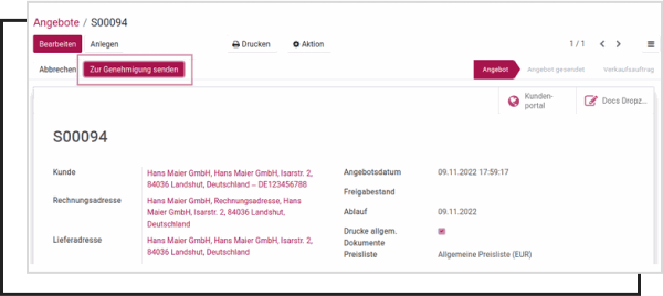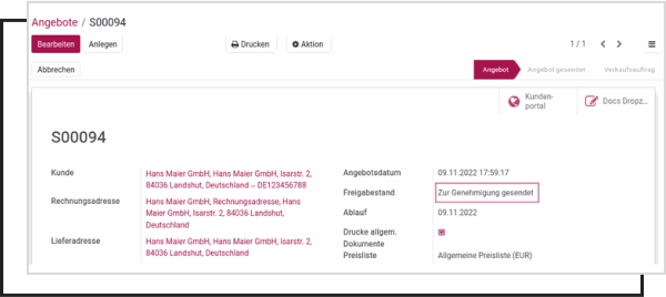 Sending the quotation is locked until approval is granted
